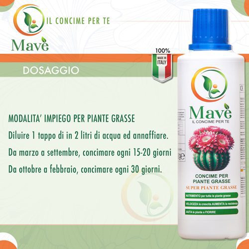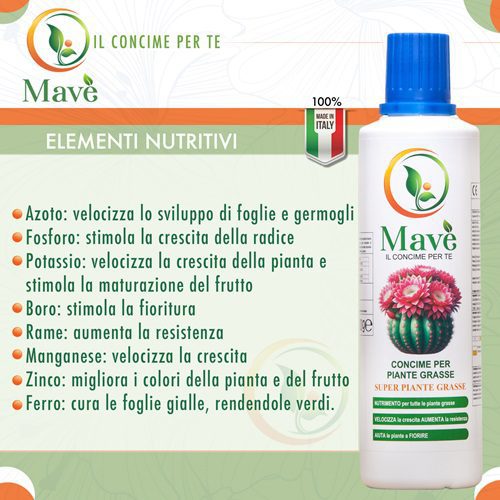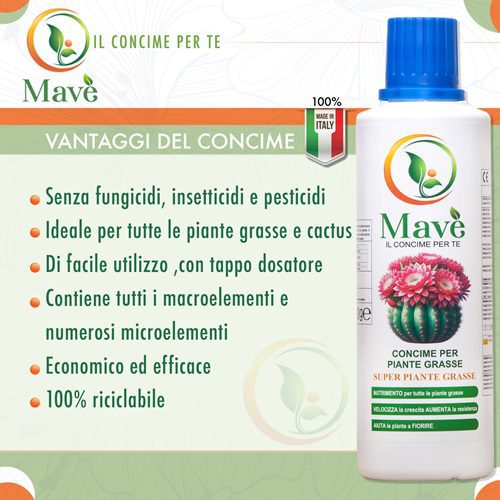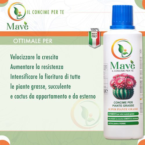 Se stai cercando un concime liquido SPECIFICO per piante grasse, cactus e succulente, sei nel posto giusto, con il fertilizzante Mavè super piante grasse puoi concimare TUTTE le piante grasse e TUTTI i cactus: Mavè, il concime per te!