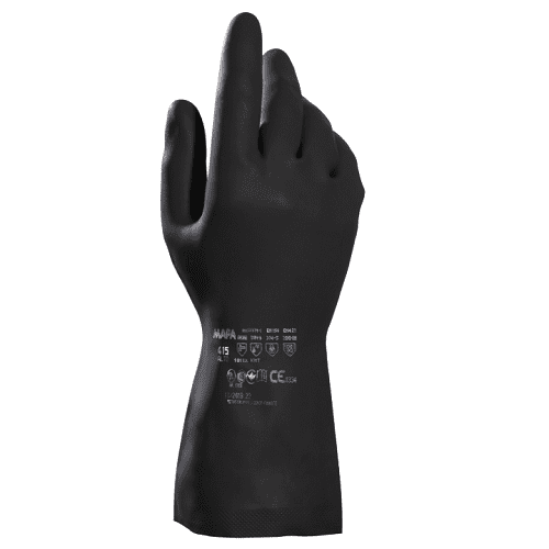 Guanti in neoprene e lattice, prodotti da MAPA professional, modello alto 415, interno floccato, esterno zigrinato, lunghezza 32 centimetri, spessore 6 millimetri.